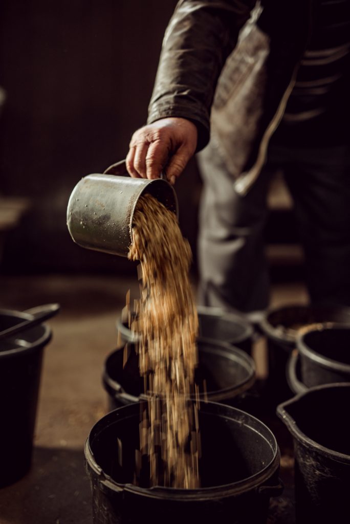 - Запаренный овес с добавление пшеничных отрубей, дробленой кукурузы, ячменя и свекольной мелассы — 2 раза в день.